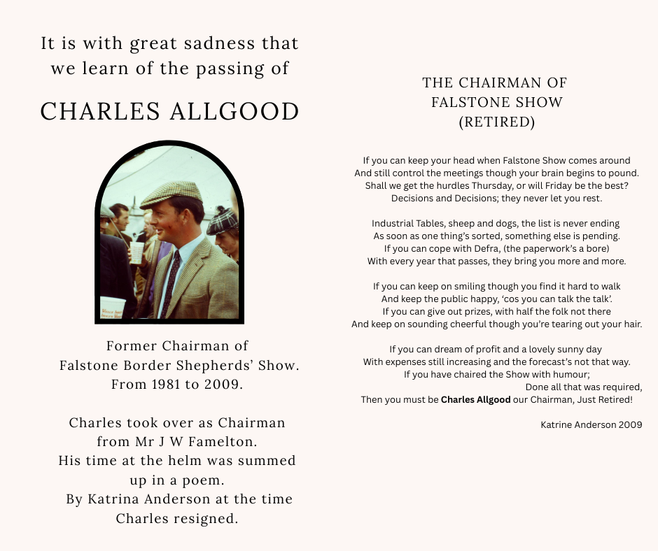 The Falstone Border Shepherds’ Show was established in 1885. Held in Falstone Northumberland each August, the Show includes classes for Blackfaced, Swaledale Cross, Mule Sheep and ‘Any other breed’, shepherds’ dogs, terriers, hounds, sheep dog trial, vegetables, cakes, eggs, sewing, knitting, sticks, children’s work, homemade drinks, photography, children’s and adult’s sports, fell race, quoits.